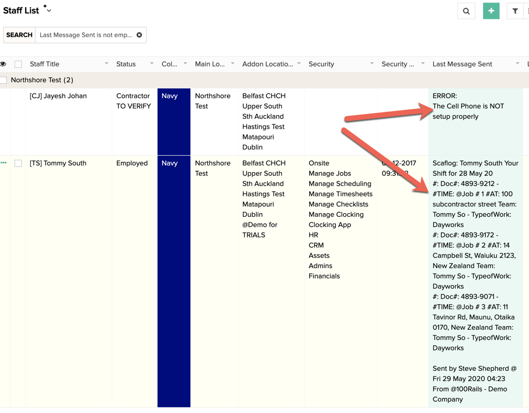 When you send notifications the system will update the "LAST MESSAGE SENT" field in the Staff List of the HR MENU. You can see what the message was and when it got sent as below.