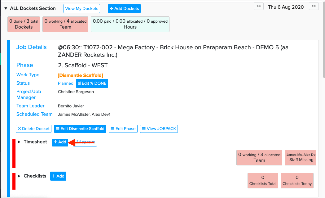 Adding and editing timesheets is a function in My Dockets for the Leading hands, If you cannot access these steps, a security change will be required. Contact your office to obtain the right securities.