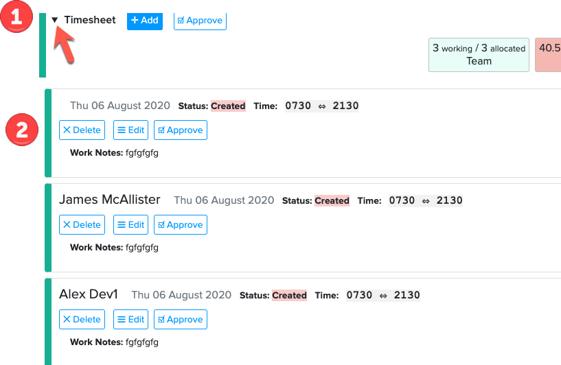 2. You can Delete or Edit the time sheet, Delete will delete timesheet. Clicking on Edit will "pop" open that particular persons timesheet and then you can edit the details inside as required.