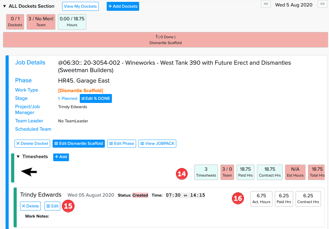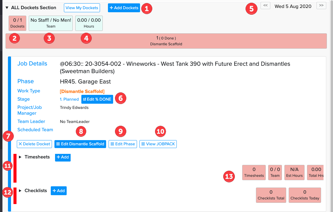 My Dockets is a way the people on site can fill in timesheets, add checklists, view the Job Pack, edit % Done etc.