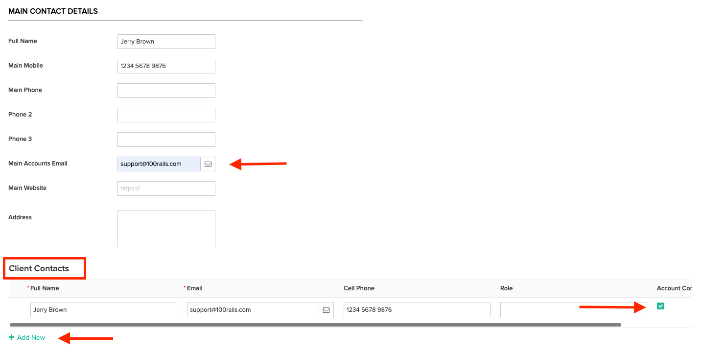 Add any other contacts to this client by clicking on the + Add New in the Client contacts area