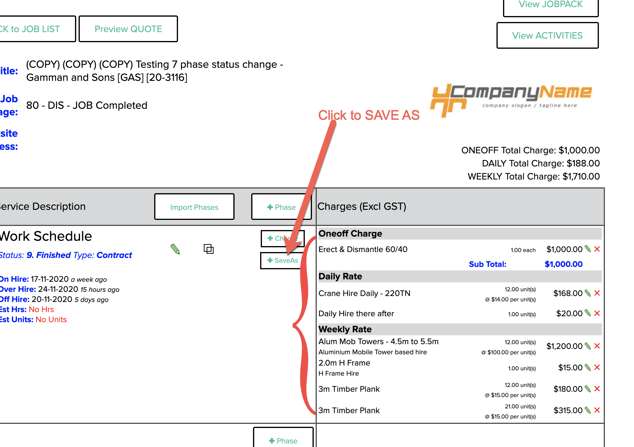 1. SAVE AS while editing a Quote. This method allows you to SETUP a phase (as shown in the image) and then use the SAVE AS button to store the phase name and line items for later use.