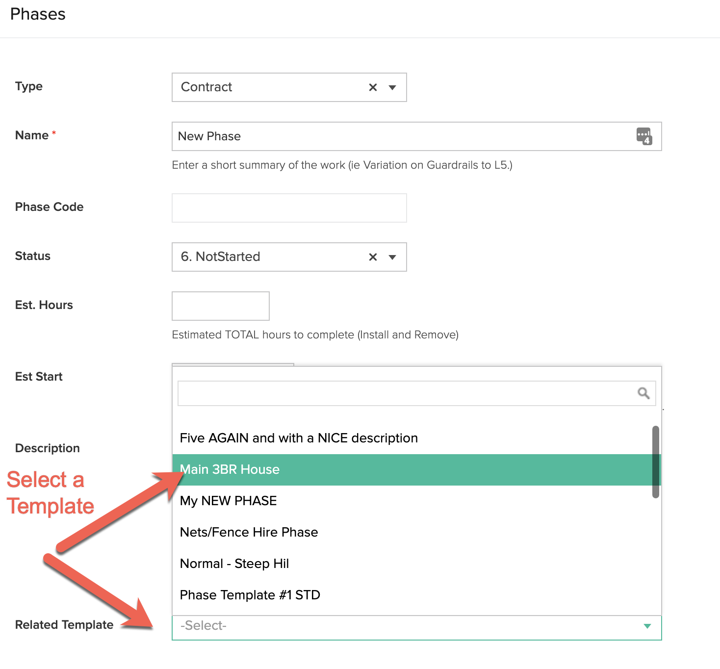 2. RELATED TEMPLATE. When you are SETTING UP a NEW PHASE you can select a template for loading the charge line items from the phase templates.