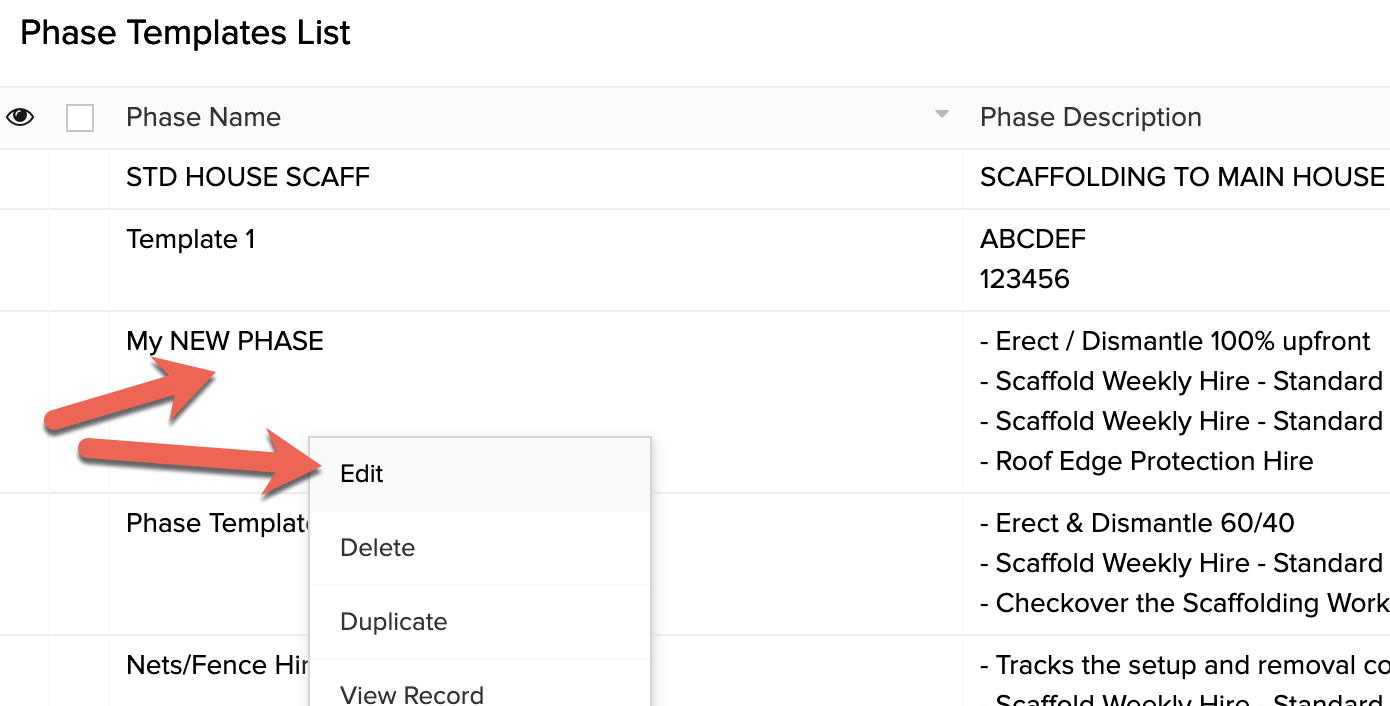 Navigate to the ADMIN MENU and select the PHASE TEMPLATES List option. You can then RIGHT CLICK and edit the phase templates and change what you would like. (see below)