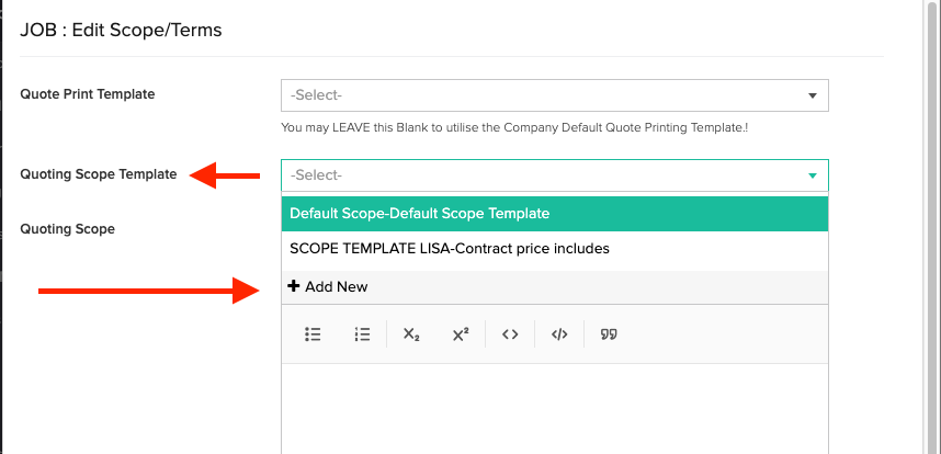 Click in the dropdown box next to Quoting Scope Template and click + Add New