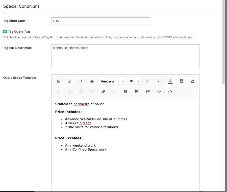 Add your ShortCode and short description in the Tag Full Description box (This is how you will recognise this template from any others you may set up). Tick Tag Quote Text and this will open the full screen to enable you to add all the scope you require. You will have the ability to format your text.