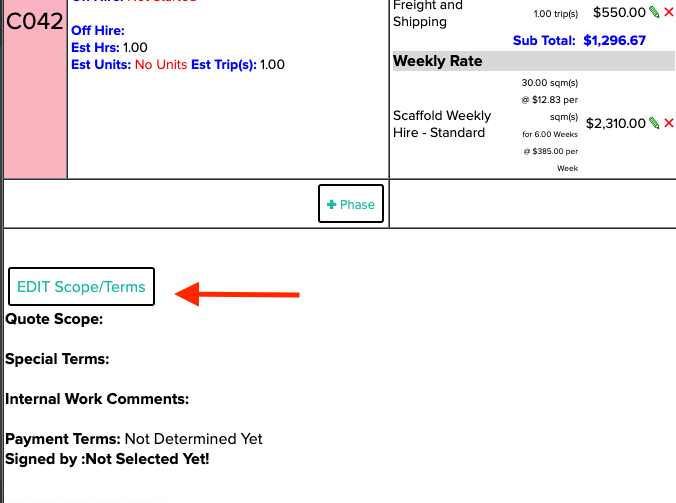 You can add a scope template when entering a quote by clicking EDIT Scope/Terms