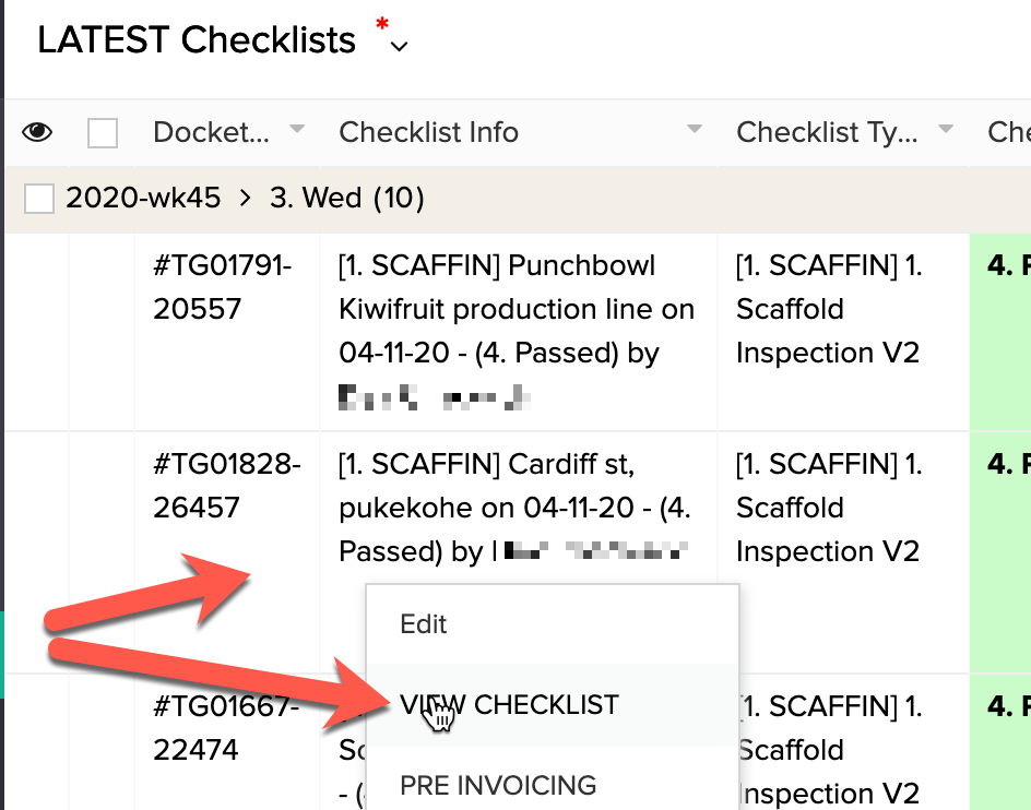 NB. FROM anyone of these reports simply RIGHT CLICK on the checklist you want to view and select the "VIEW Checklist" option. (see and example below)