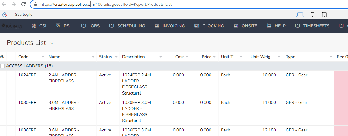 - The calculator can be turned on by setting a tick box on the PRODUCT setups. Found at https://creatorapp.zoho.com/100rails/goscaffold#Report:Products_List
