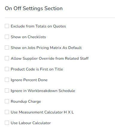 - Scroll down to the tick box area (as below) and turn the Labour Calculator On and SAVE or SUBMIT this product details.