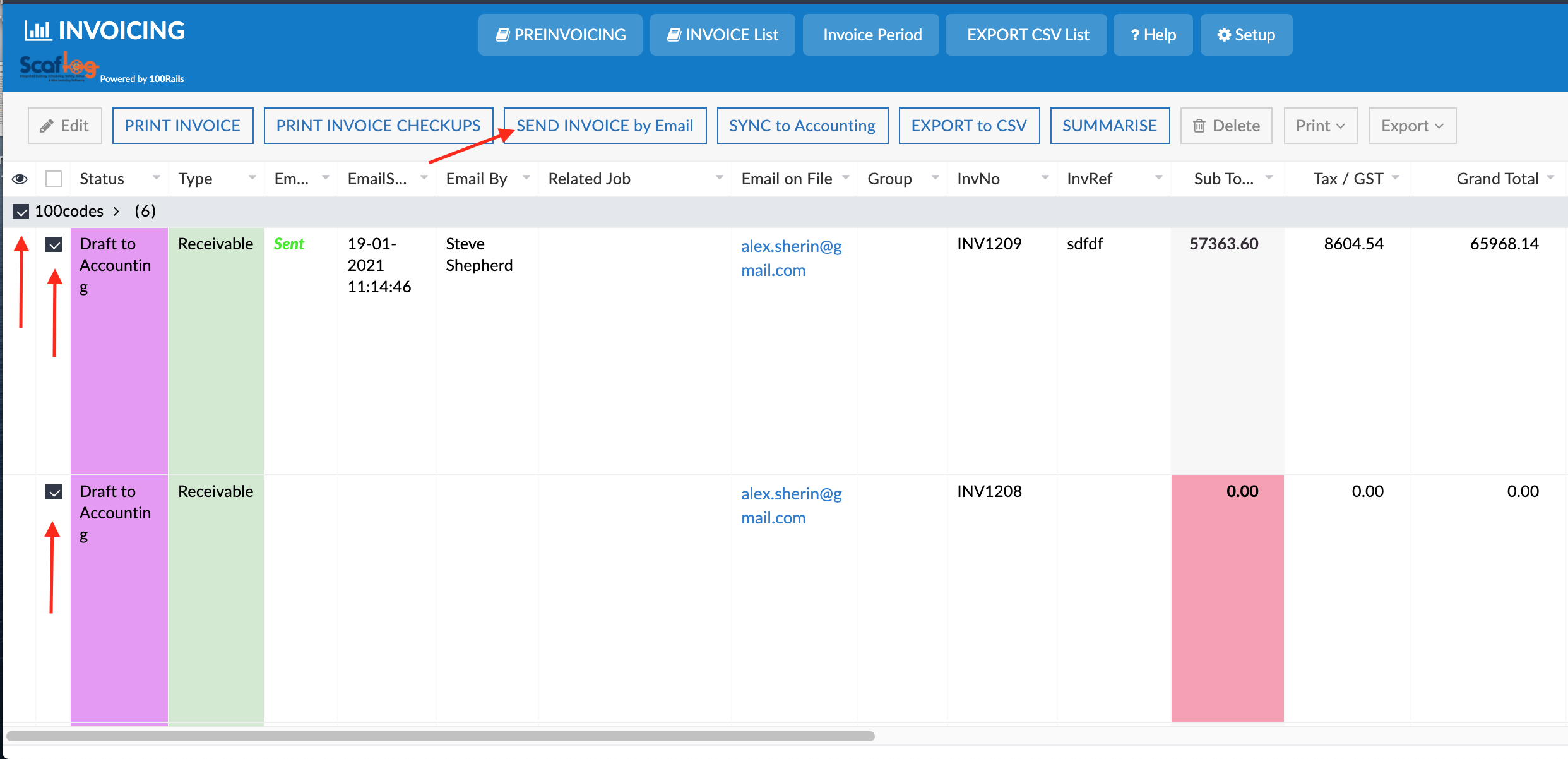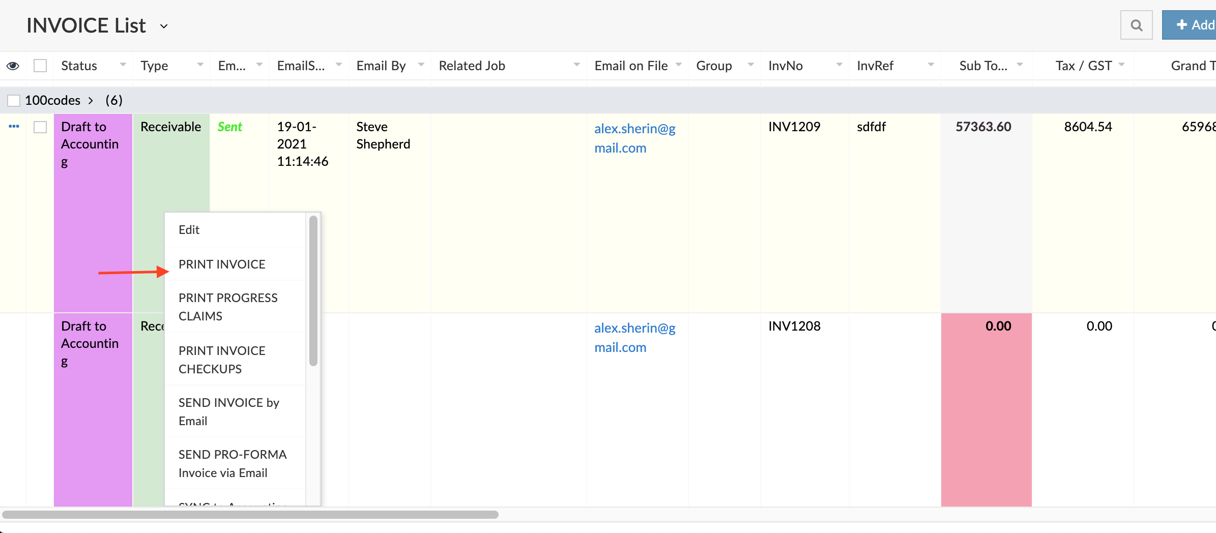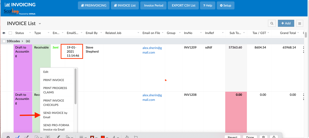Right click - select SEND INVOICE via Email - this will resend the invoice selected and will update the email sent date and time.