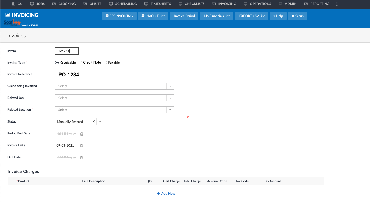 Now you can start adding the invoice charges as required. This will be dependant on what products YOUR company uses.