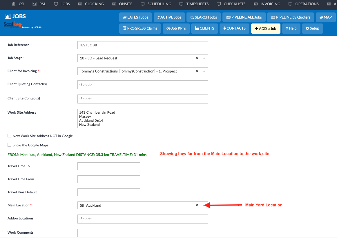1: Jobs: When entering in a new job/quote this allow the system to work out how far away each job is from your Main Location (Yard/Office)
