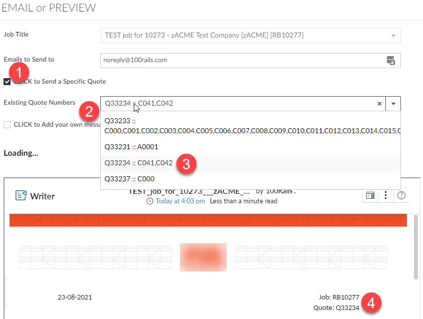 1. Click the "Click to Send a Specific Quote" tick box and a dropdown field will appear called Existing Quote Numbers.