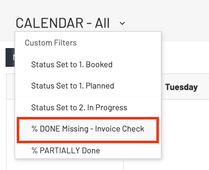 Select the "% DONE Missing - Invoice Check" and you will only see those activities that have NOT been set with any %.