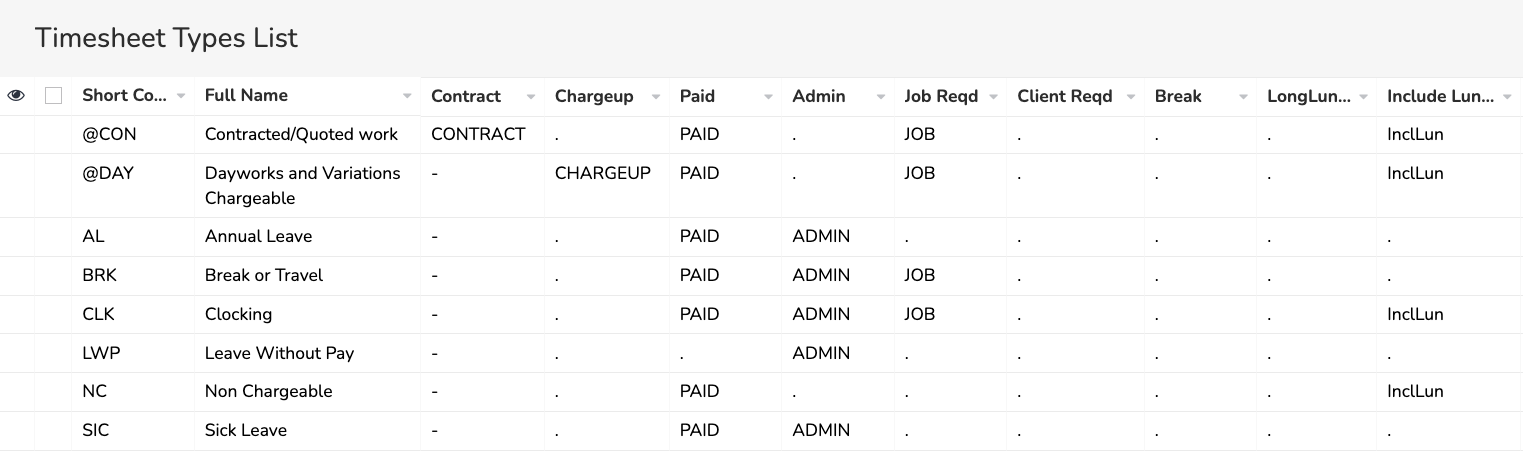 This is a standard list of timesheet types. We only change these when the client needs to identify extra types of "time" or they decide to do clocking/time allocation tracking.