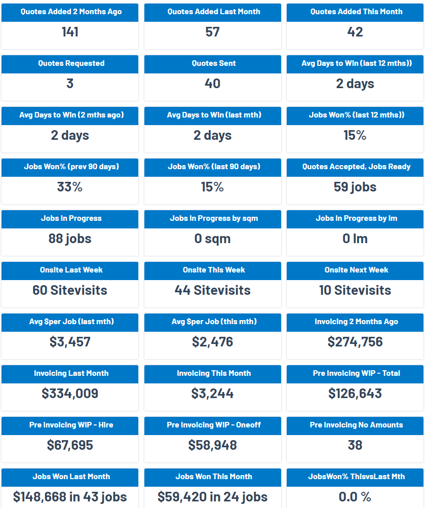 This is a count of the number of Site visits or scheduled visits in the calendar for Last week, This week and Next week. It gives an idea of the BUSY status of the business.