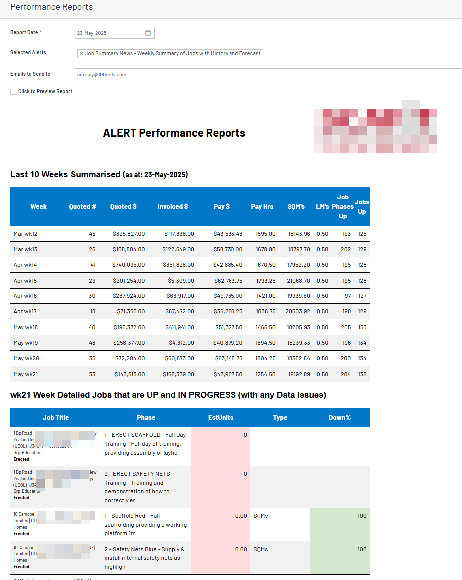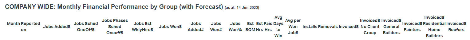 Really good report for checking on Quotes per week with count and value, plus what was invoiced in the week and paid to payroll. Then a SQM up check is also important with jobs and phases in total up.