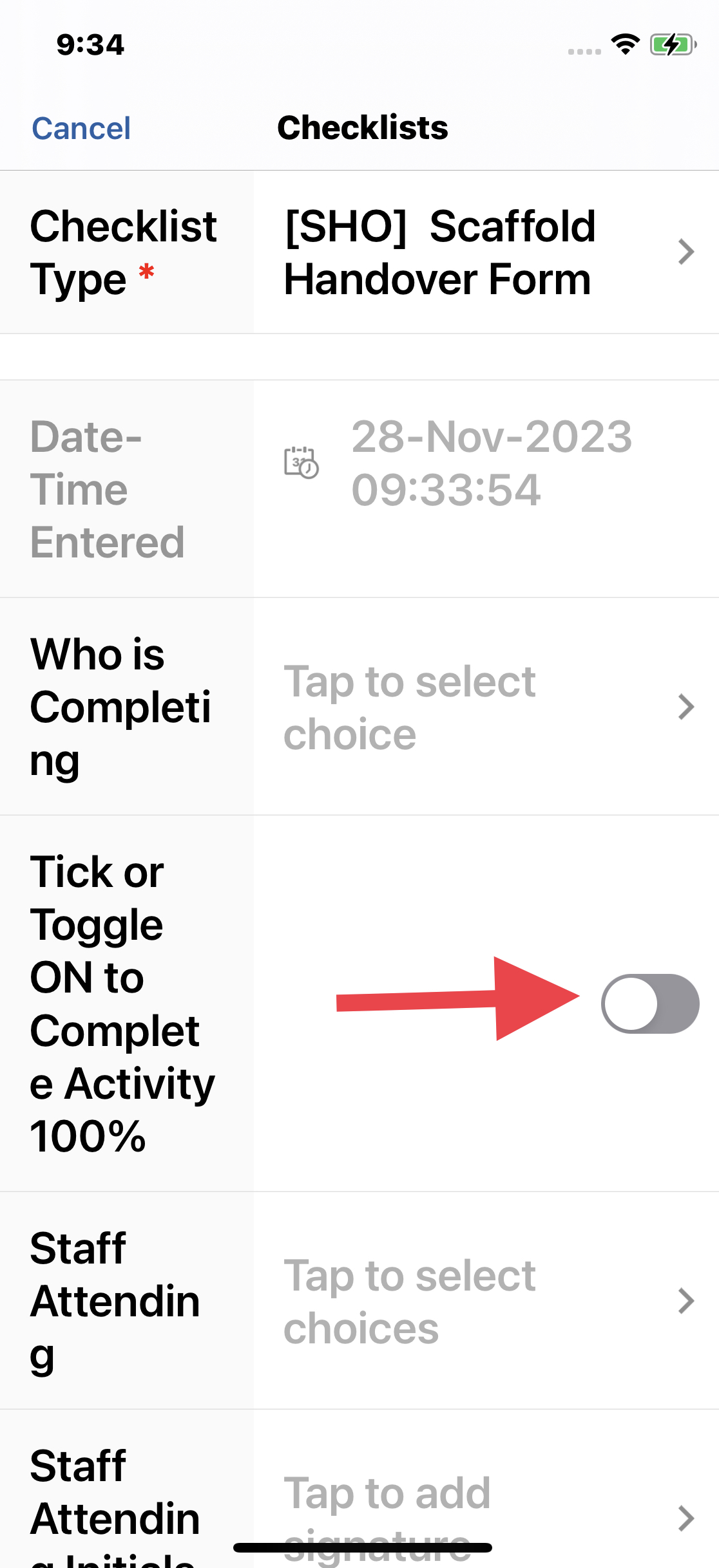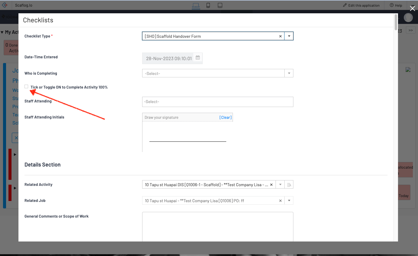 When completing a checklist like a Scaffold Handover you can now tick a box that will set the activity to 100% Done