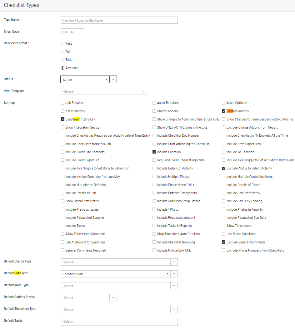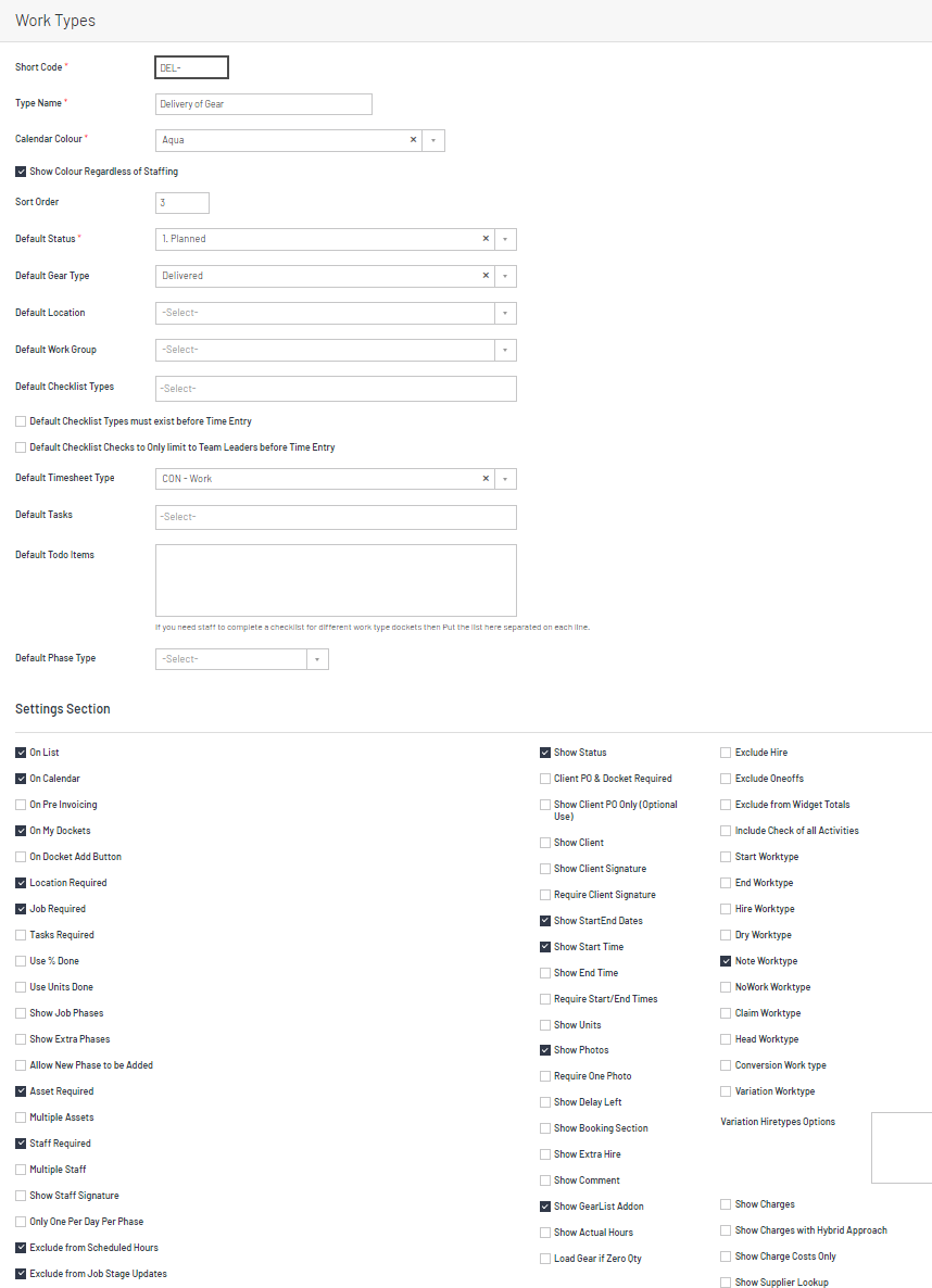 The Gear module has different settings for Gear Types. Any list of gear in the system is attached to one of these Gear Types. The gear types include: